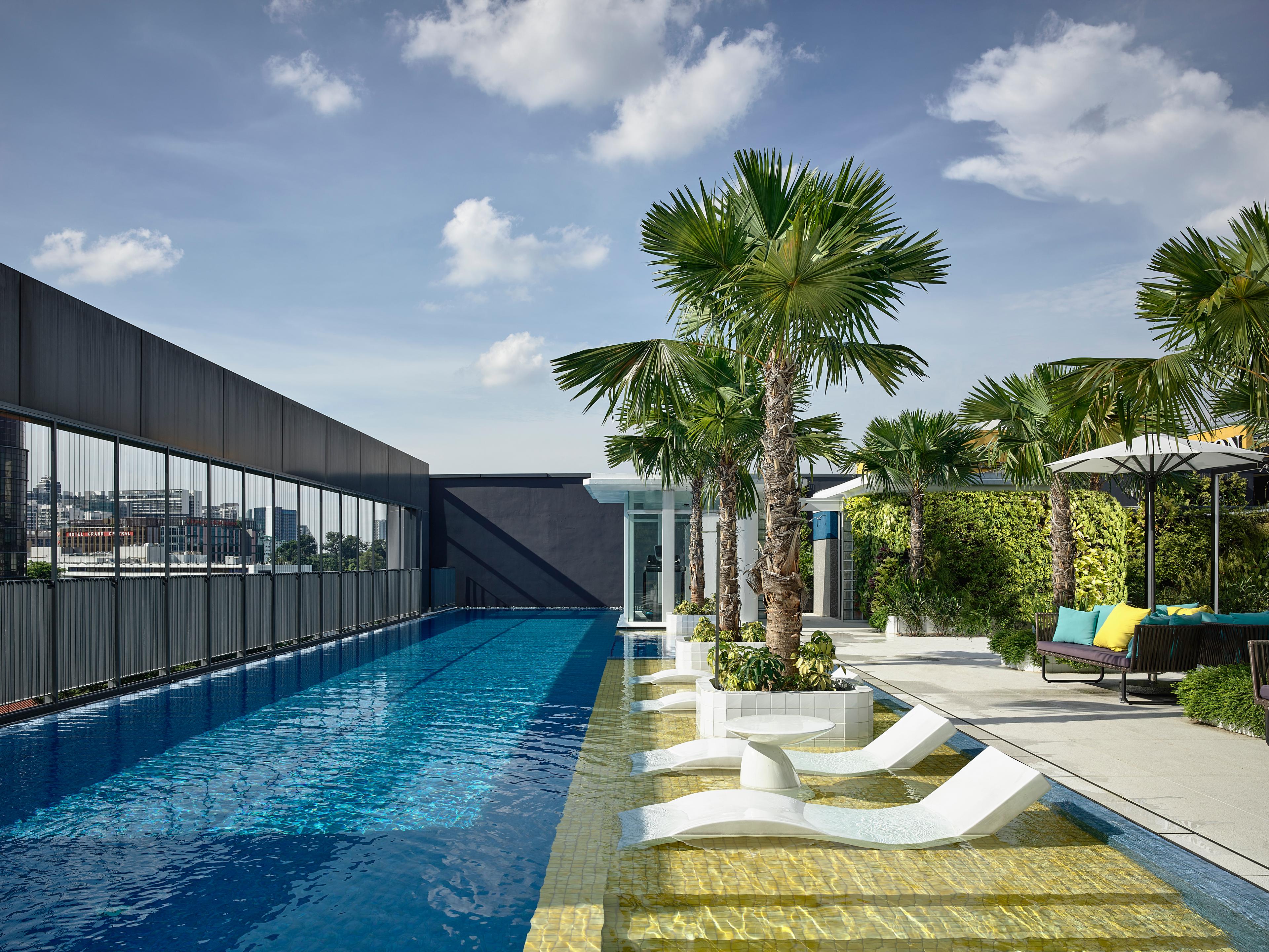 For the rooftop, the intention was to introduce a tropical respite in the heart of the city. Visitors arrive to a walkway flanked by tall palms, while the strip of yellow tiles draws one’s eyes to the pool and framed view of the cityscape beyond. The intentional use of colour-blocking and curved furniture draws nuanced references to the 80s.