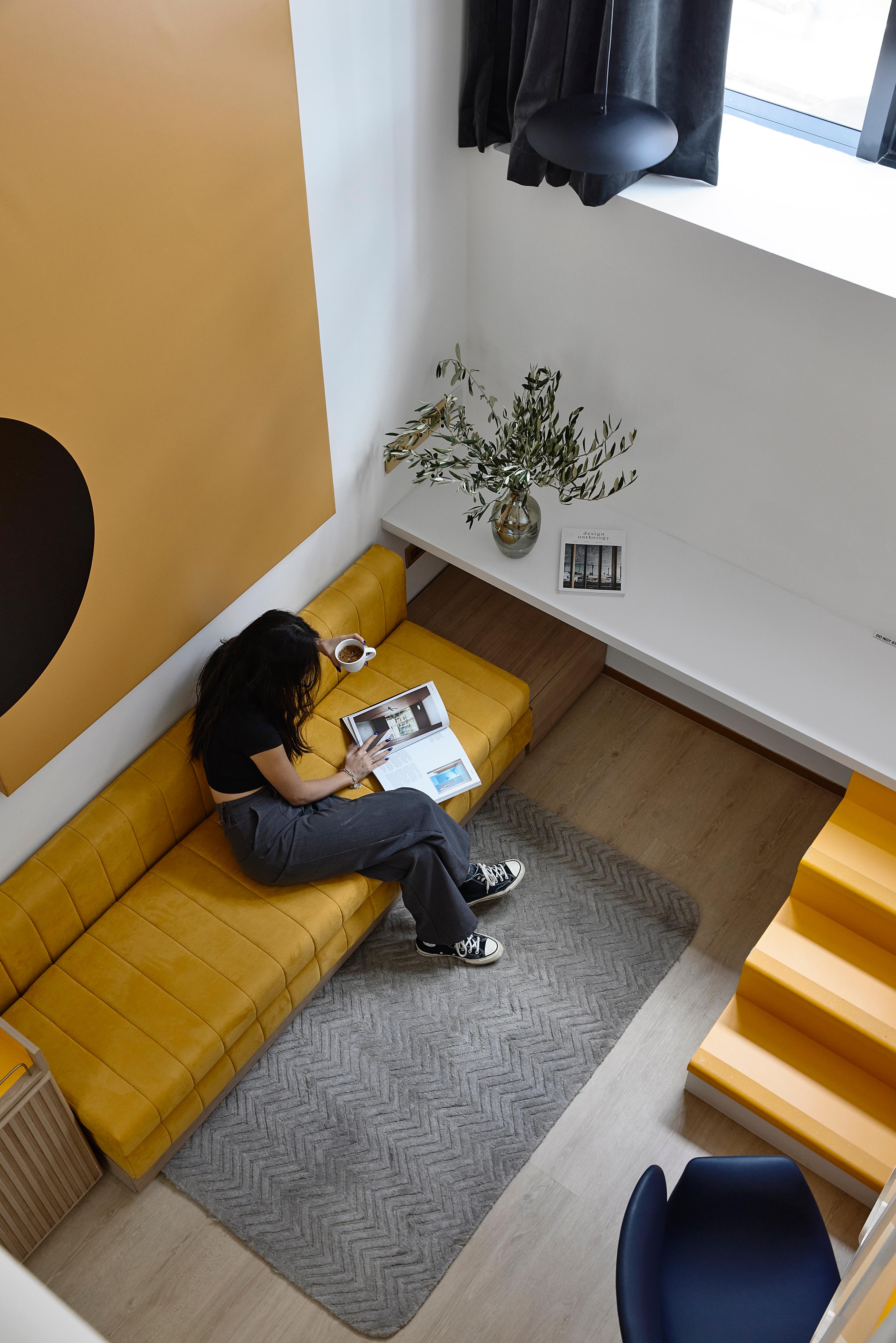 Upstairs, the rooms draw references from Rediffusion radio station’s glory years in the 60s and 70s. In contrast to the refined walnut and brass palette used in the lobby, these spaces feature striking pops of colour and contrasting material. The 1960s themed rooms capture the era’s conservative yet lively mood. Rooms are decked in cornflower yellow and accented with white, presenting a bold yet unique vibe. On the upper storeys, rooms evoke a more refined vibe reminiscent of the 1970s, along with pops of orange and avocado green to add a playful accent.Each space was carefully curated down to the soft finishes to ensure that each room would project a strong identity and provide guests with a memorable stay. Though the rooms are relatively compact, no expense was spared to ensure that every corner was well designed yet functional. Every detail is intentional: for instance, the room's built-in bench edging was inspired by the iconic façade of the now defunct National Theatre which used to be located just down the road.